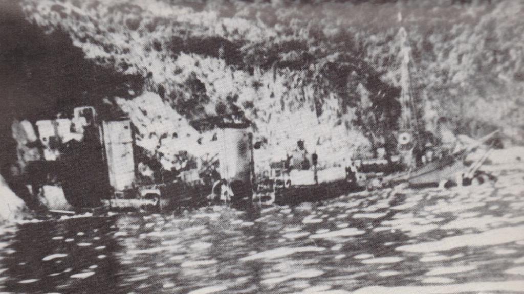 At 22:50 hrs, one of Lt Schmidt’s officers reported all hands killed in boiler room No. 3. Incessant explosions racked the ship. Fires erupted, blinding smoke billowed, and the crew were in disarray. Their only hope of escaping the ceaseless barrage was to head for shore and abandon ship.