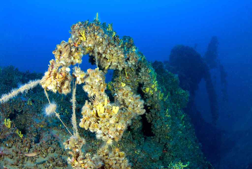Forward of the deck gun, the entire bow section – about a quarter of the submarine’s total 67.1 metre length – is simply missing. The mine struck under the forward torpedo room, which was also an area that doubled as the crew’s quarters. With water being such a dense medium and virtually incompressible, the main force of the blast was directed upwards and onto the hull. This literally blew the front of the submarine off, leaving a cross-sectional hull breach. However, the twisted metal and marine growth found there today negate any notion of wreck penetration.
