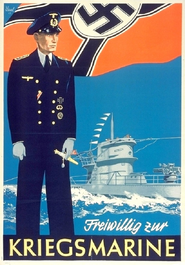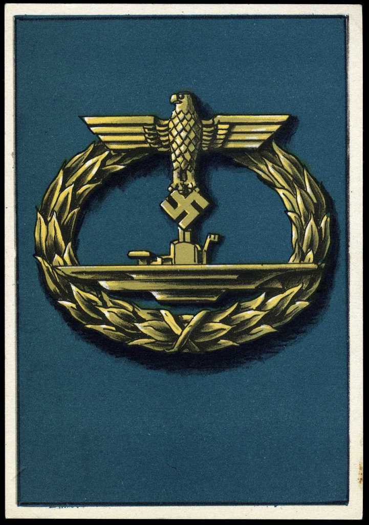 Left: A German propaganda poster with the exhortatory caption: ‘Voluntarily join the Kriegsmarine’. Right: A German postcard depicting the badge of the U-Boat War Badge (U-Boot Kriegsabzeichen). Acquisition required participation in two combat patrols. Source: Dimitri Galon