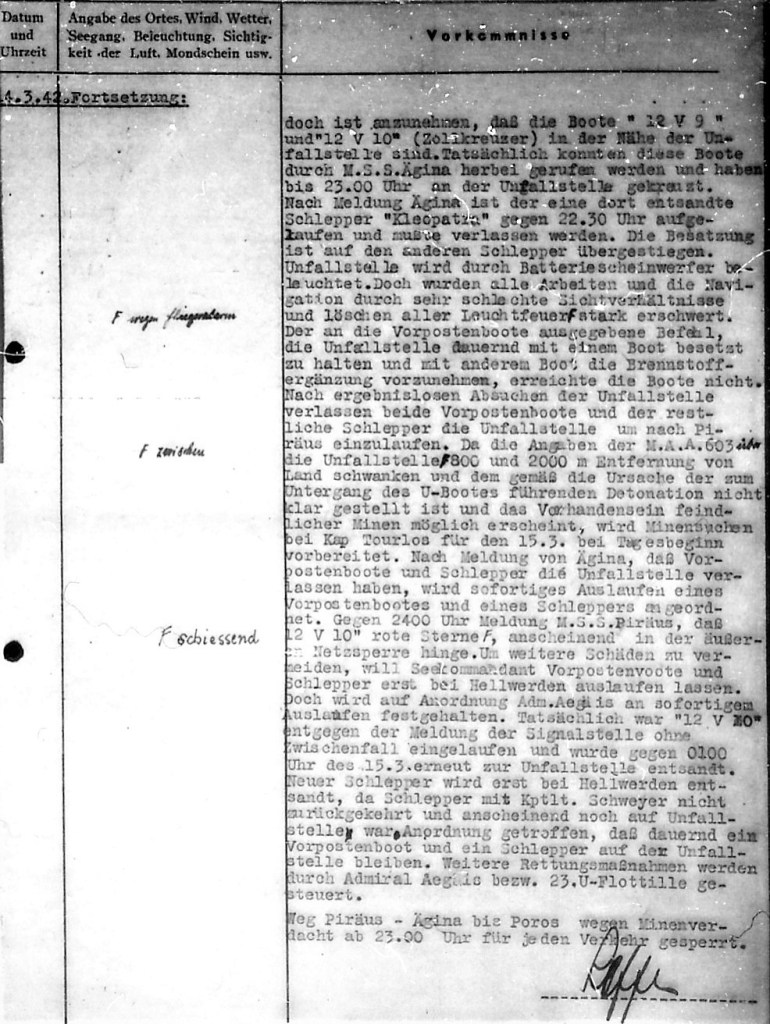 The event was witnessed by lookouts of the Kriegsmarine 603rd Coastal Artillery stationed at Cape Tourlos and duly recorded (somewhat dispassionately) in their War Diary: