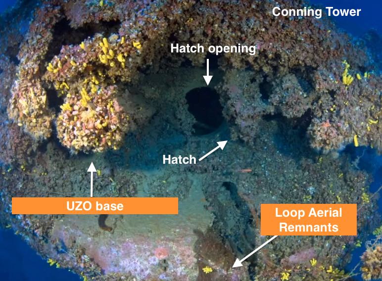 Hovering directly above the conning tower, the base of the UZO (U-Boot-Zielobjektiv) is still distinguishable, despite thick encrustations. Special binoculars (with night vision capability) mounted on the UZO were, like both periscopes, linked to an onboard electro-mechanical torpedo data computer manufactured by Siemens. This worked out firing solutions for the fire control system and was absolutely cutting-edge in its day. Type VIIc U-boats also had radio direction finding capability and the scant remnants of the loop aerial base can be seen. However, the compass is missing from its encrusted gimbal, having been removed by Stathis Baramatis in 1986 as tangible proof of discovery. Unsurprisingly, the hatch on the conning tower deck is fully open, confirming that U-133 was on the surface when disaster struck.