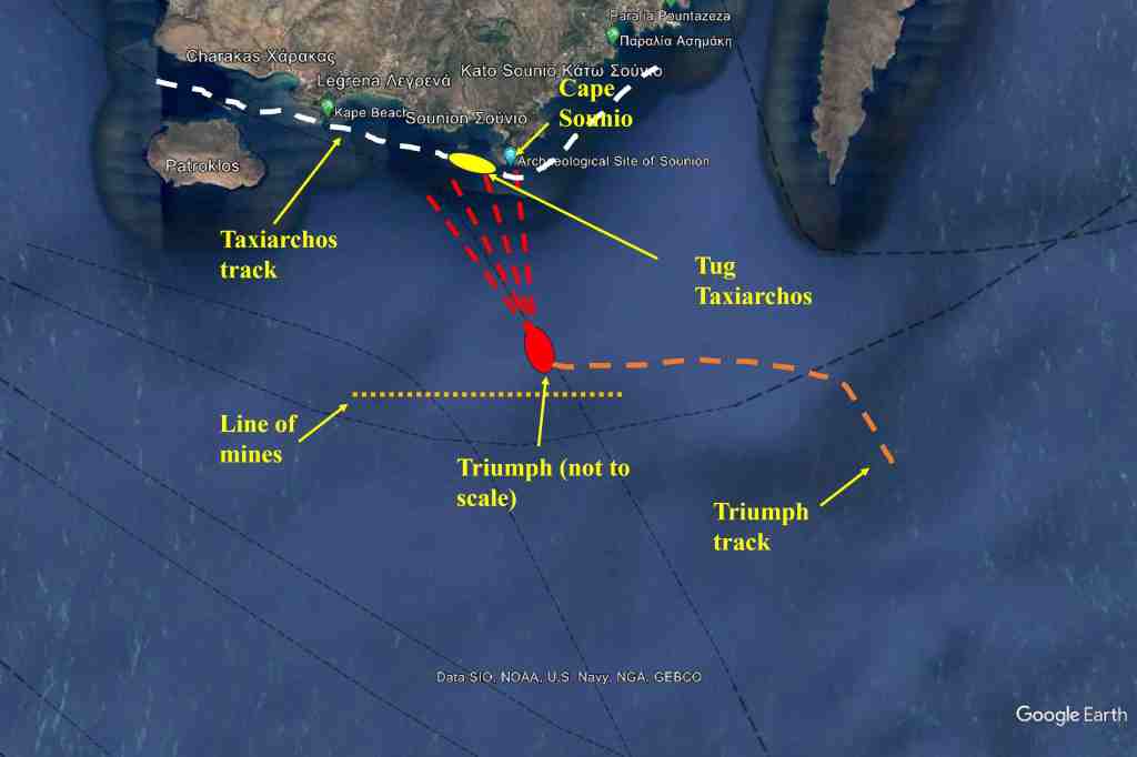 Here we see a map of Triumph’s attack. At top is Cape Sounio. The white dashed line is the track of traffic passing around the cape from Piraeus.