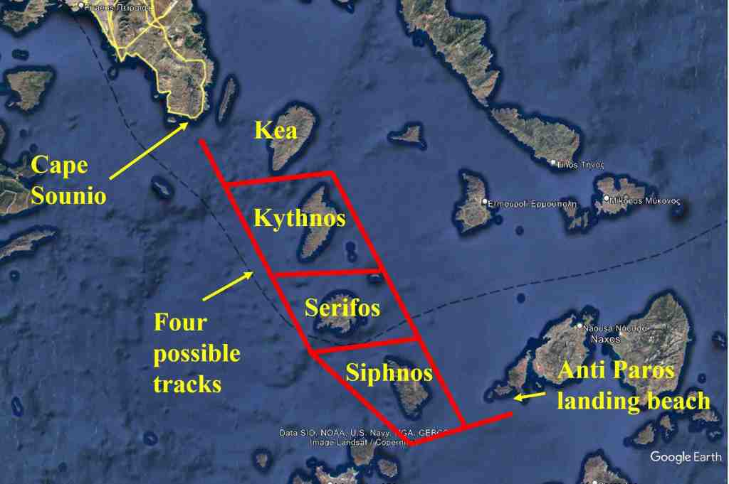The northern track option passed between Kea and Kythnos. Two middle options passed between Kythnos and Serifos, and Serifos and Siphnos. The southern track option passed south of Siphnos.