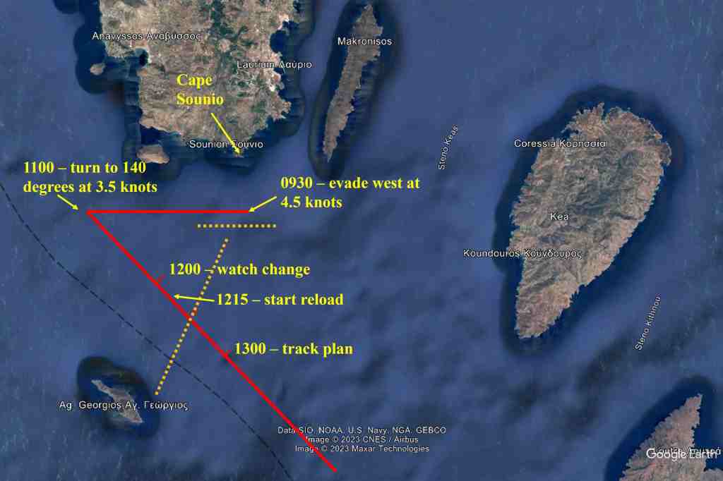 To follow this plan, Triumph would have to leave the area of Cape Sounio by about 10:00 hrs, providing some ‘fat’ in the schedule between dawn and 10:00 hrs to fit in an attack before leaving, if a target presented itself.