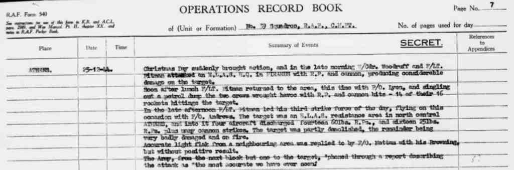 ↩︎ - No. 39 Squadron RAF ORB 25 Dec 1944: ‘Christmas Day suddenly brought the motion, and in the late morning W/Cdr. Woodruff and F/Lt. Pitman attacked an E.L.A.S. H.Q. in PIRAEUS with R.P. and cannon, producing commendable damage on the target.