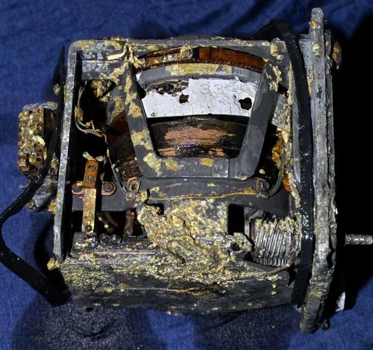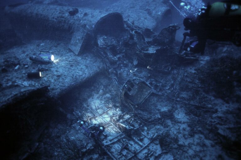 Without the protection of the canopy, the cockpit, once the proud place of command and control, had yielded to the relentless embrace of the sea – its almost complete degradation presented a serious obstacle to their quest to find the metal ID plate. Was it concealed within the scant vestiges of the cockpit? Scattered instruments, assorted debris, and even a crew seat lay all around outside the fuselage. Could it be there? Irrespective of where it might be, had it corroded beyond recognition, or simply disintegrated entirely?