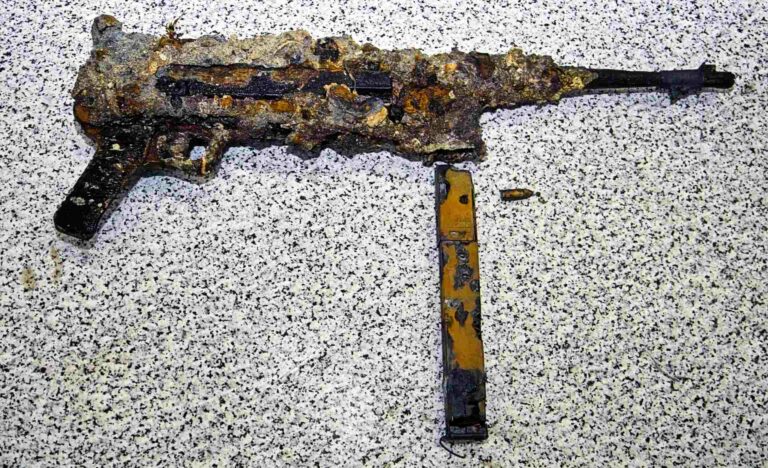 Two subsequent trips to the site within their remaining allotted time proved unsuccessful in locating the ID plate. Nonetheless, Vasilis and Yannis managed to salvage intriguing artefacts for preservation. Among these were a distress flare gun, a lamp, a safety belt buckle from one of the crew seats, and several bullets. The most notable discovery was a MP-40 ‘Schmeisser’ submachine gun accompanied by six magazine clips.