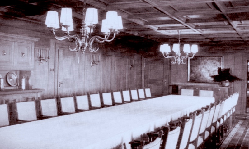 “The room itself, with its windows cut through the six-foot walls, was the last word in luxuriously finished accoutrements. In all, it contained 18 large upholstered chairs, three wicker deck chairs with pads and pillows, six marble topped tables, one radio and one combination radio-phonograph.