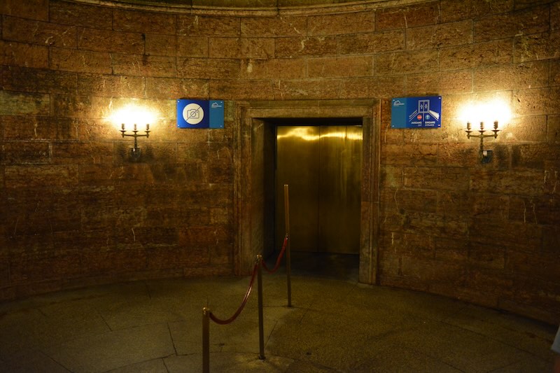 There are steps at the front of the Eagle’s Nest, descending in front of the main reception hall, which soon towers over the visitor. Here, a difficult trail winds all the way down to the parking area of the bus terminus. Of course, it is much quicker, easier and safer to take the elevator down – which is exactly what Hitler did on each infrequent visit he made, although he was reportedly concerned that the mechanism would fail or that the winch motor would be struck by lightning.