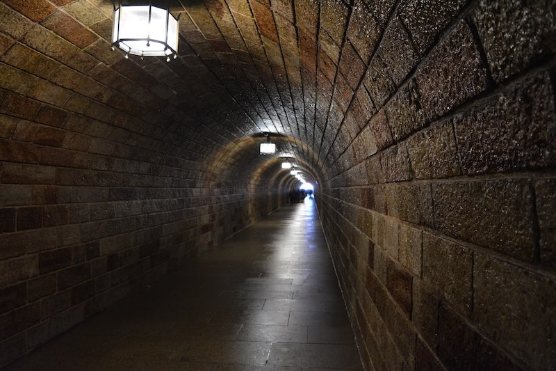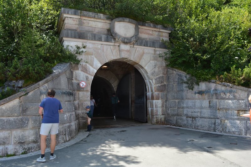 Upon arriving at the bus terminus, visitors are immediately drawn into the eerie atmosphere of the Eagle’s Nest by the entrance portal to a long, dimly lit tunnel. The thick marble archway above bears the date ‘1938’ – a subtle yet powerful reminder of its true origins. A closer look at the hefty double brass doors reveals the faint etchings left by American and French soldiers who liberated the area in 1945. Beyond lies the 120 metre marble-lined tunnel, skillfully hewn out of the rock. Originally heated by air from a parallel service tunnel, it once served as the grand entryway for Nazi dignitaries chauffeured in Mercedes, who had to reverse all the way back out due to the lack of a turning circle at the end. Today, visitors must walk the length of the tunnel, their anticipation mounting with each step.