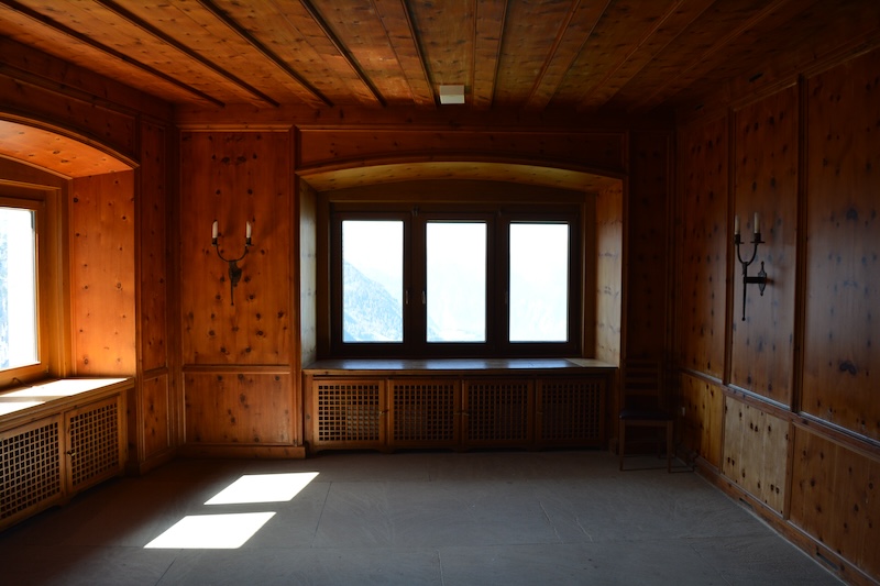 On the southern side of the reception hall, through an impressive doorway, a short flight of stairs leads to what is commonly referred to today as the ‘Eva Braun Room’. This much smaller space, lined with luxurious Swiss knotted pine panelling, features two large picture windows facing south and east. These offer stunning views of the Scharitzkehlalm – the room’s original namesake (Scharitzstube) – as well as the Königssee and the peaks of the Hohen Göll and Watzmann. Both windows could once be lowered almost completely, providing an unobstructed view of the breathtaking landscape outside. Today, they have been replaced by less remarkable fixed glazing.