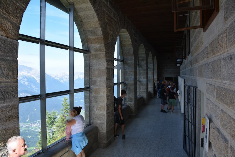 The eastern door opens onto a long, low-walled sun terrace, offering another breathtaking picture-postcard view of the Königssee and the surrounding mountains through a series of five wide arches, which have since been enclosed with glass. This sun terrace now hosts a picture gallery of the Eagle’s Nest, showcasing its construction, the building of the access road, and various moments from its historical use.
