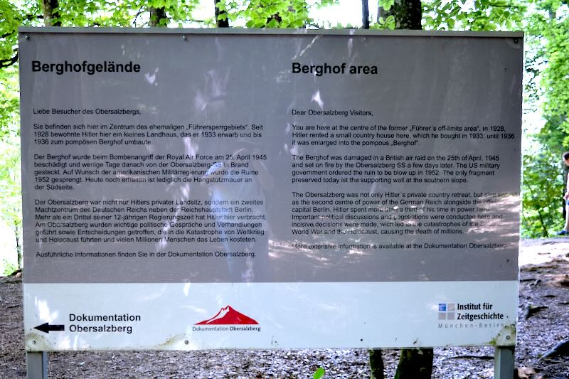 “You are at the centre of the former Führer’s restricted area. In 1928, Hitler rented a small country house here, which he purchased in 1933. By 1936, it was expanded into the grandiose Berghof. The Berghof was damaged in a British air raid on April 25, 1945, and set on fire by the SS a few days later. In 1952, the US military government ordered the ruins to be blown up. The only fragment preserved today is the retaining wall on the southern slope.