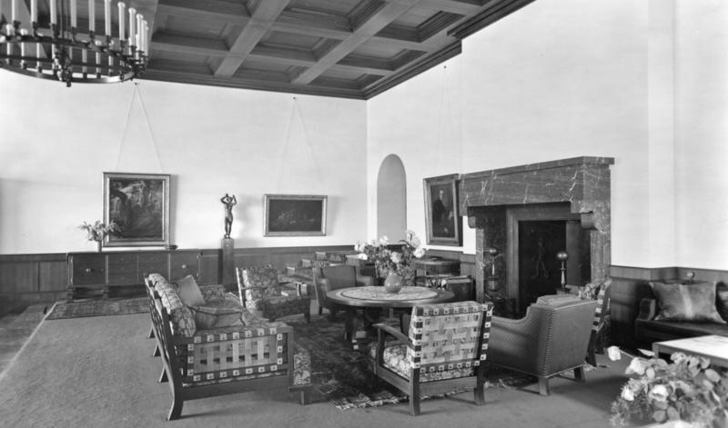 The entrance hall is filled with a curious display of cactus plants in majolica pots. Herr Hitler’s study is fitted as a modern office, and leading out of this is a telephone exchange. From here it is possible for the Führer to invite friends or Ministers to fly over to Berchtesgaden, landing on his own aerodrome just below the chalet lawns.