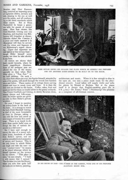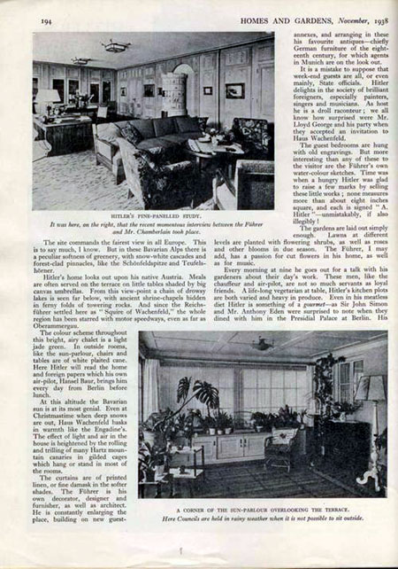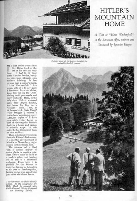 “It is over twelve years since Herr Hitler fixed on the site of his one and only home. It had to be close to the Austrian border, barely ten miles from Mozart’s own mediaeval Salzburg. At first no more than a hunter’s shack, ‘Haus Wachenfeld’ has grown until it is to-day quite a handsome Bavarian chalet, 2,000 feet up on the Obersalzberg amid pinewoods and cherry orchards. Here, in the early days, Hitler’s widowed sister, Frau Angela Raufal, kept house for him on a ‘peasant’ scale. Then, as his famous book Mein Kampf (‘My Struggle’) became a best-seller of astonishing power (4,500,000 copies of it have been sold), Hitler began to think of replacing that humble shack by a house and garden of suitable scope. In this matter he has throughout been his own architect.