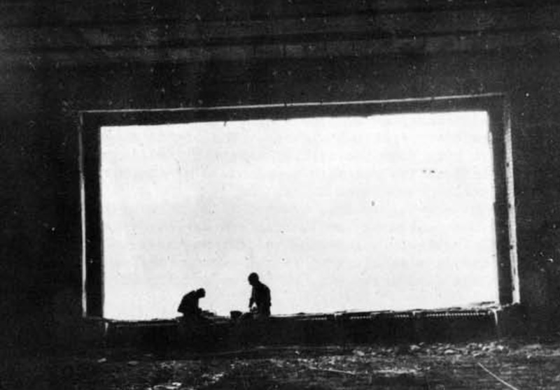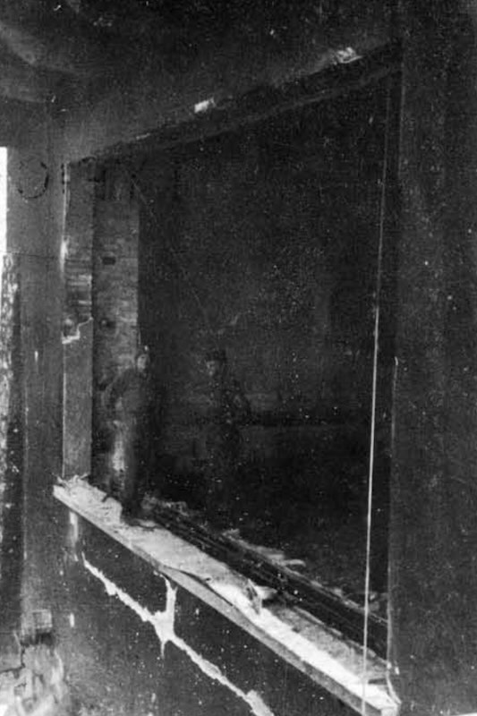 The main room, which measured approximately 45 x 70 feet (14 x 21 m), stood as an empty black shell. Describing the scene, the report stated, “The 17 x 25 foot (5.2 x 7.6 m) window in front of which Hitler delighted in having himself photographed was scattered in innumerable broken and melted pieces of plate glass.” Among the debris lay the twisted springs of upholstered chairs and remnants of several radios that had succumbed to the flames. Despite the devastation, the mantle of the 10 foot (3 m) red marble fireplace remained intact, albeit white and broken, evidence of the intense heat that had warped the grates in the firebox.
