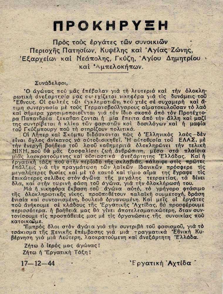 Liber and Scobie are being taught that the Greek people are not a crowd incapable of self-government. The self-sacrifice of ELAS, with the active assistance of the people every day, completes the final VICTORY that will secure us Human Life, within the framework of a people-controlled and genuinely independent Greece. And the working class that fought in the first lines for the realisation of the popular ideals in the struggle against slavery, now, in the current phase of the struggle for its completion, offers the greatest sacrifices and, with its hot and honourable blood, writes the most epic pages in the struggle of the great four-year period, giving everything for the current phase of the struggle for its completion.
